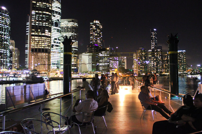 Boarding and disembarking from the Lower Boardwalk at Eagle Street Pier, 1 Eagle Street, Brisbane. Boarding from 5.30pm for a prompt 6:00pm departure. Please check in at our booking office on the boardwalk level at Eagle Street Pier prior to boarding the vessel. Check-in is open from 2 hours prior to your departure time
